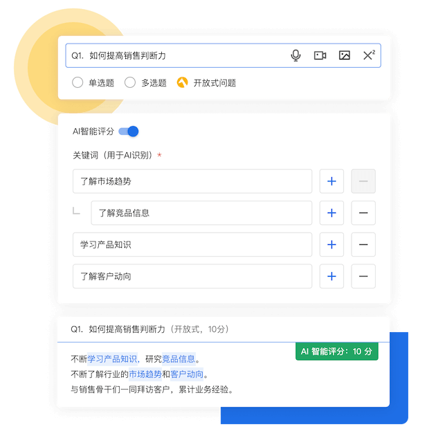 通过题库随机组卷,引导学员间隔、重复、刻意练习,帮助新销售形成产品认知。