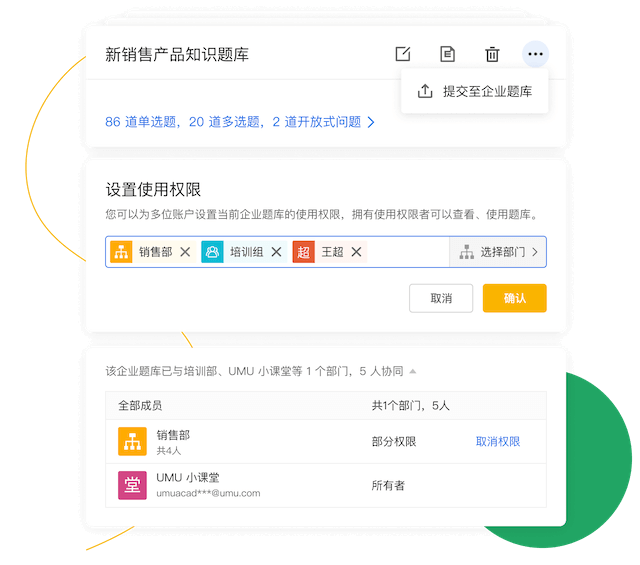 UMU 题库集中管理知识点,讲师使用题库随机组建考卷。游戏化每日一考,企业开展日常考试竞赛。帮助学员以考代学、间隔练习。
