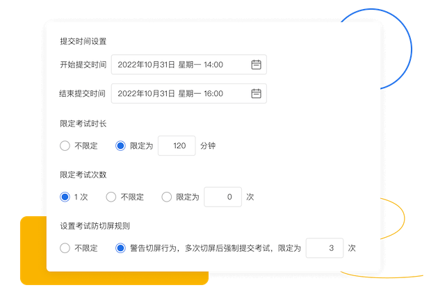 讲师可设置考试开始时间与结束时间、规定考试总时长、调整考试参与次数,要求学员在规则内完成考试。