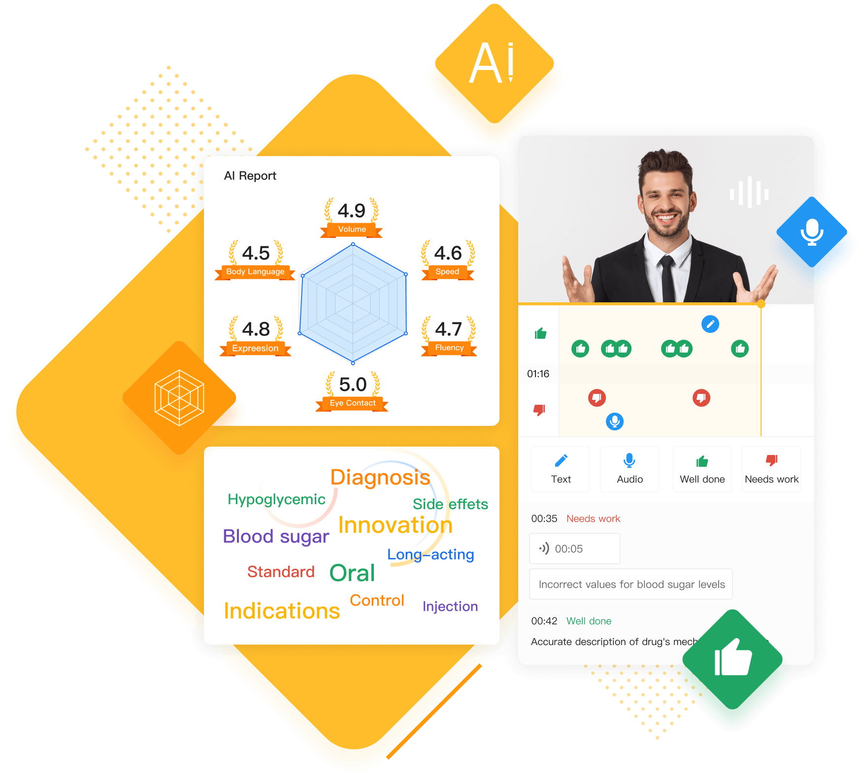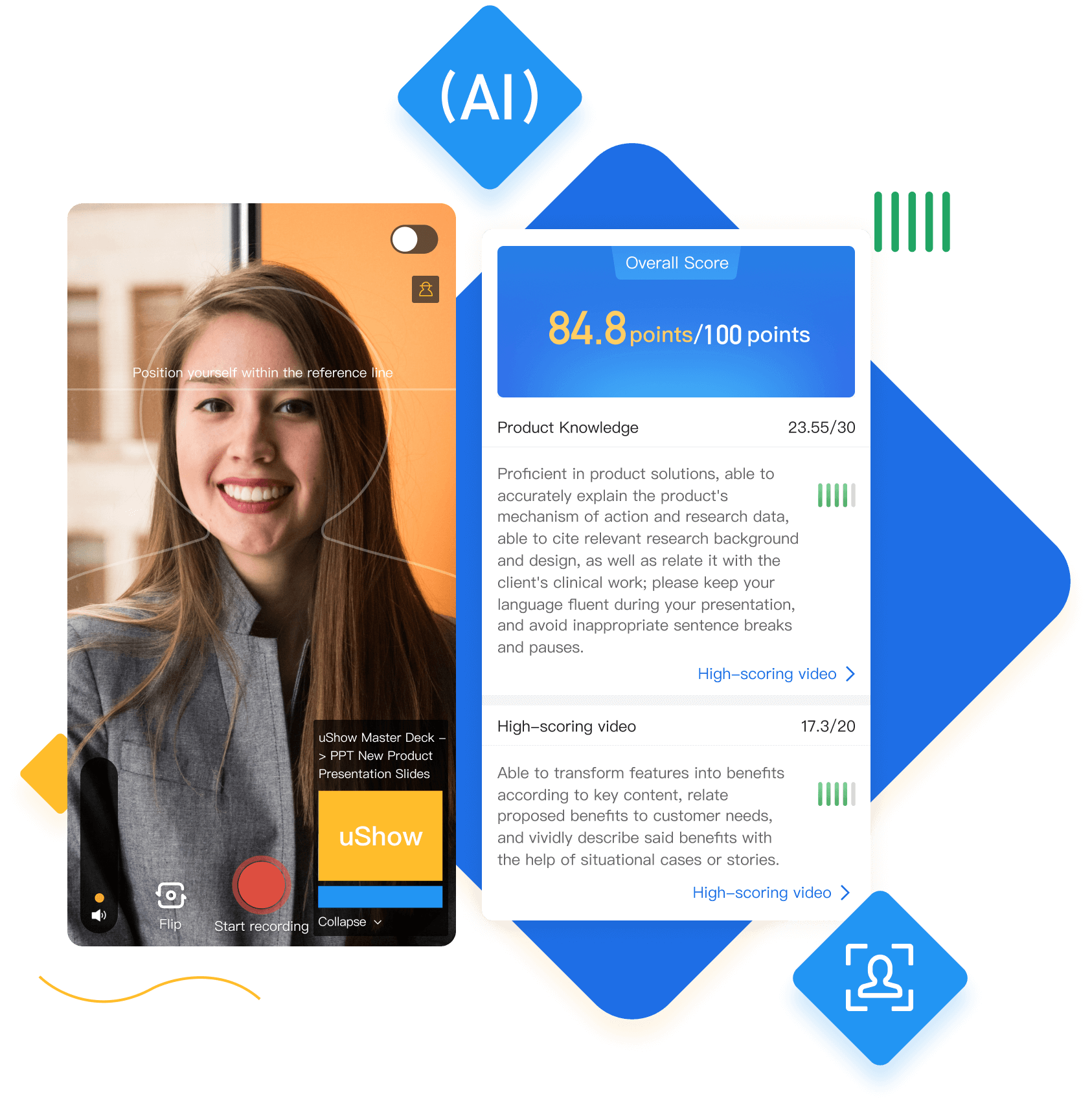 Give your reps real-time, structured and personalized feedback on their sales pitch practice with uShow's simulated business scenarios.